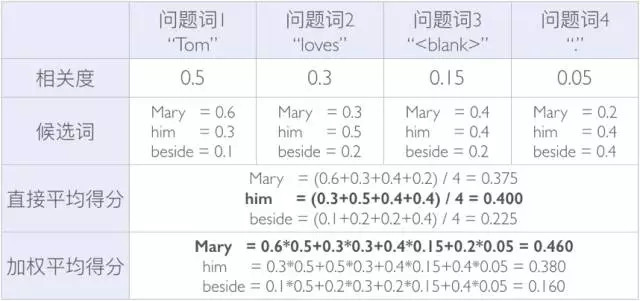 鉴于不同问题词的贡献不同,求得他们的加权得分再合并,得到每个候选词的最终得分,从而找出适合填入空缺中的词(表中第四行)。