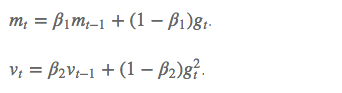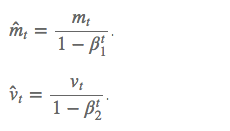 如果 mt 和 vt 被初始化为 0 向量,那它们就会向 0 偏置,所以做了偏差校正, 通过计算偏差校正后的 mt 和 vt 来抵消这些偏差: