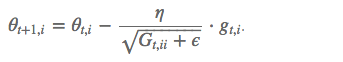 其中 G_t 是个对角矩阵, (i,i) 元素就是 t 时刻参数 θ_i 的梯度平方和。