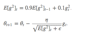 RMSprop 是 Geoff Hinton 提出的一种自适应学习率方法。RMSprop 和 Adadelta 都是为了解决 Adagrad 学习率急剧下降问题的。