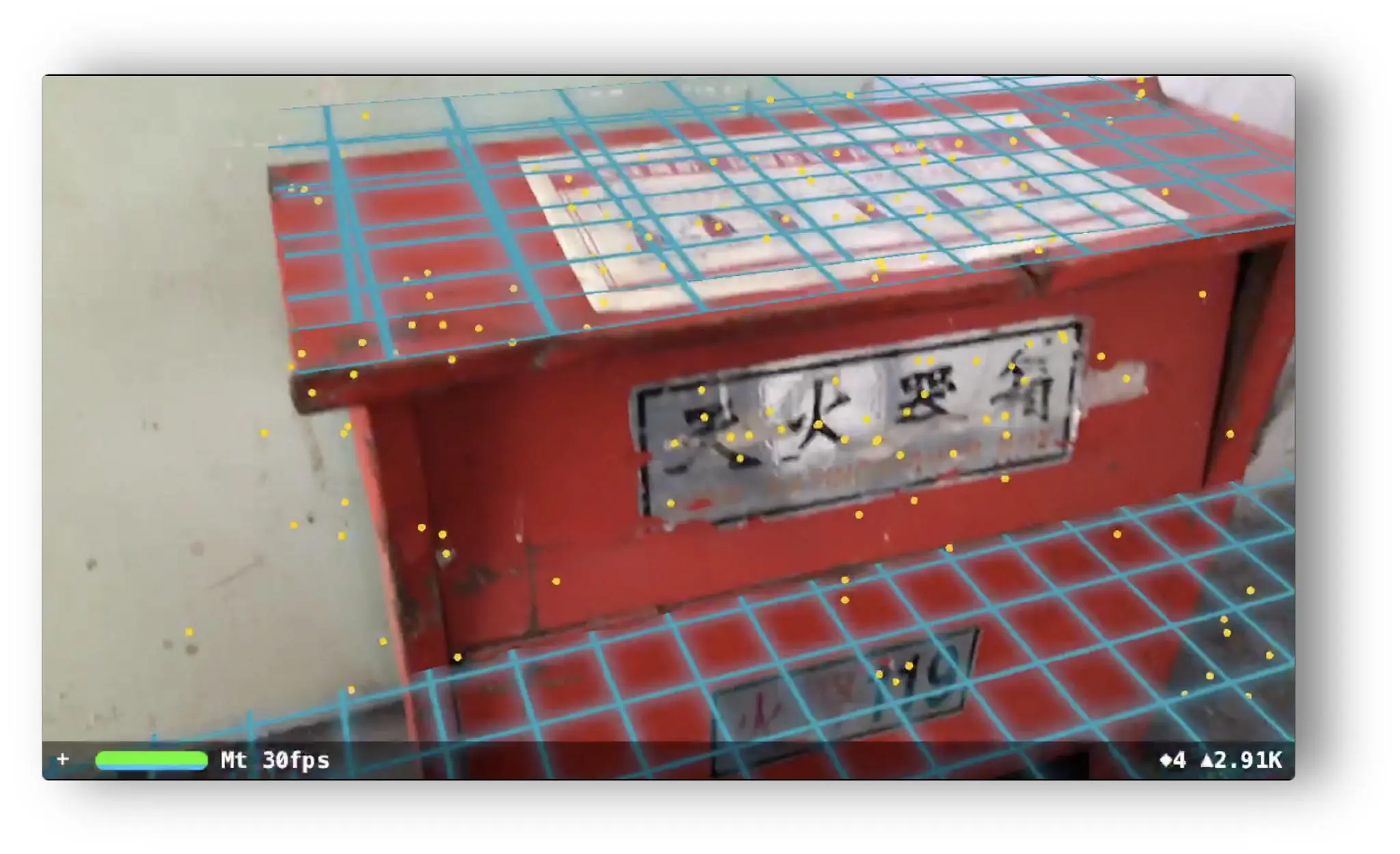 这是楼梯上的灭火器箱,ARKit 正确找出边缘,而且平面的角度也完全正确,符合其高出地板的表面。