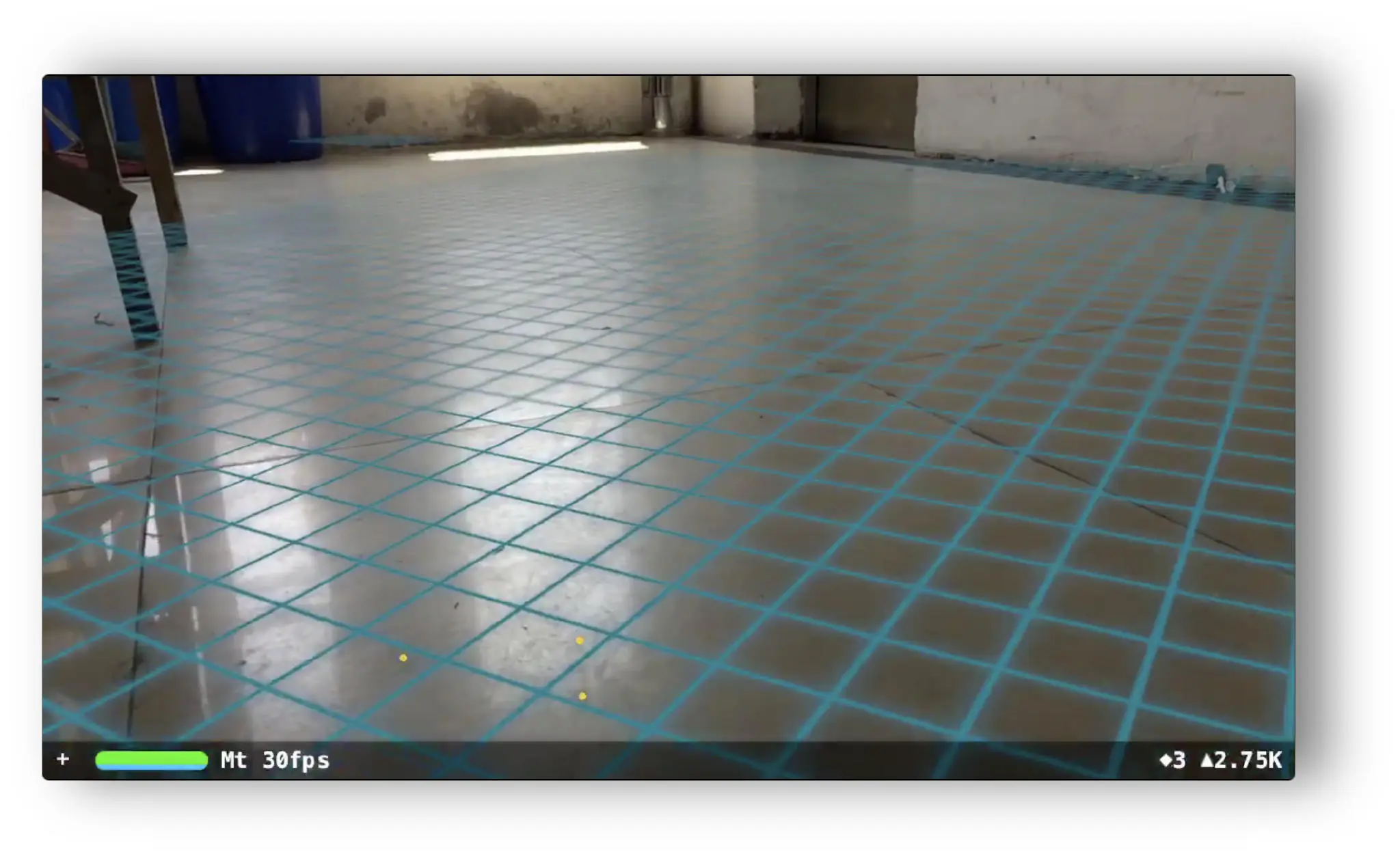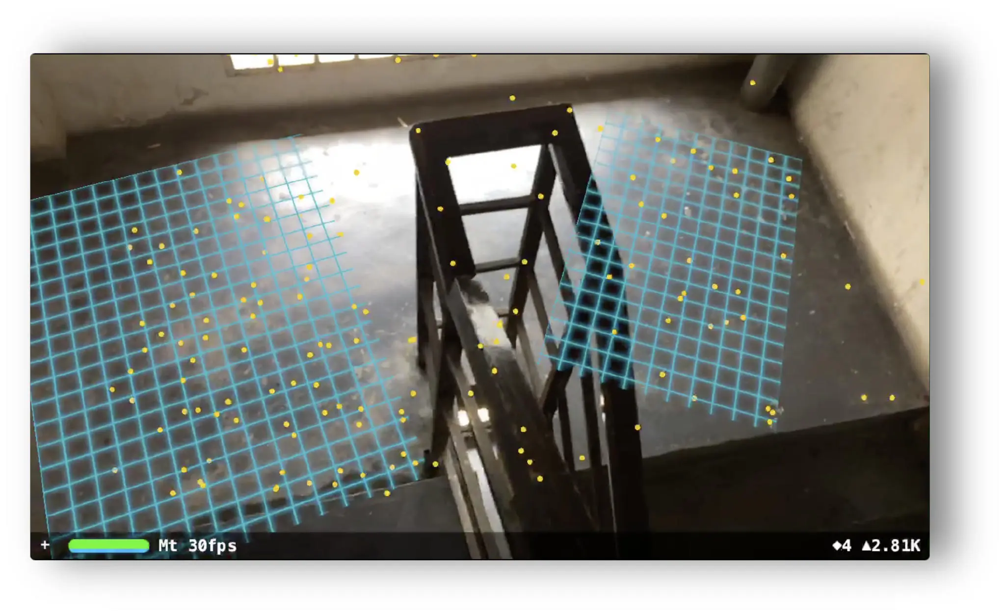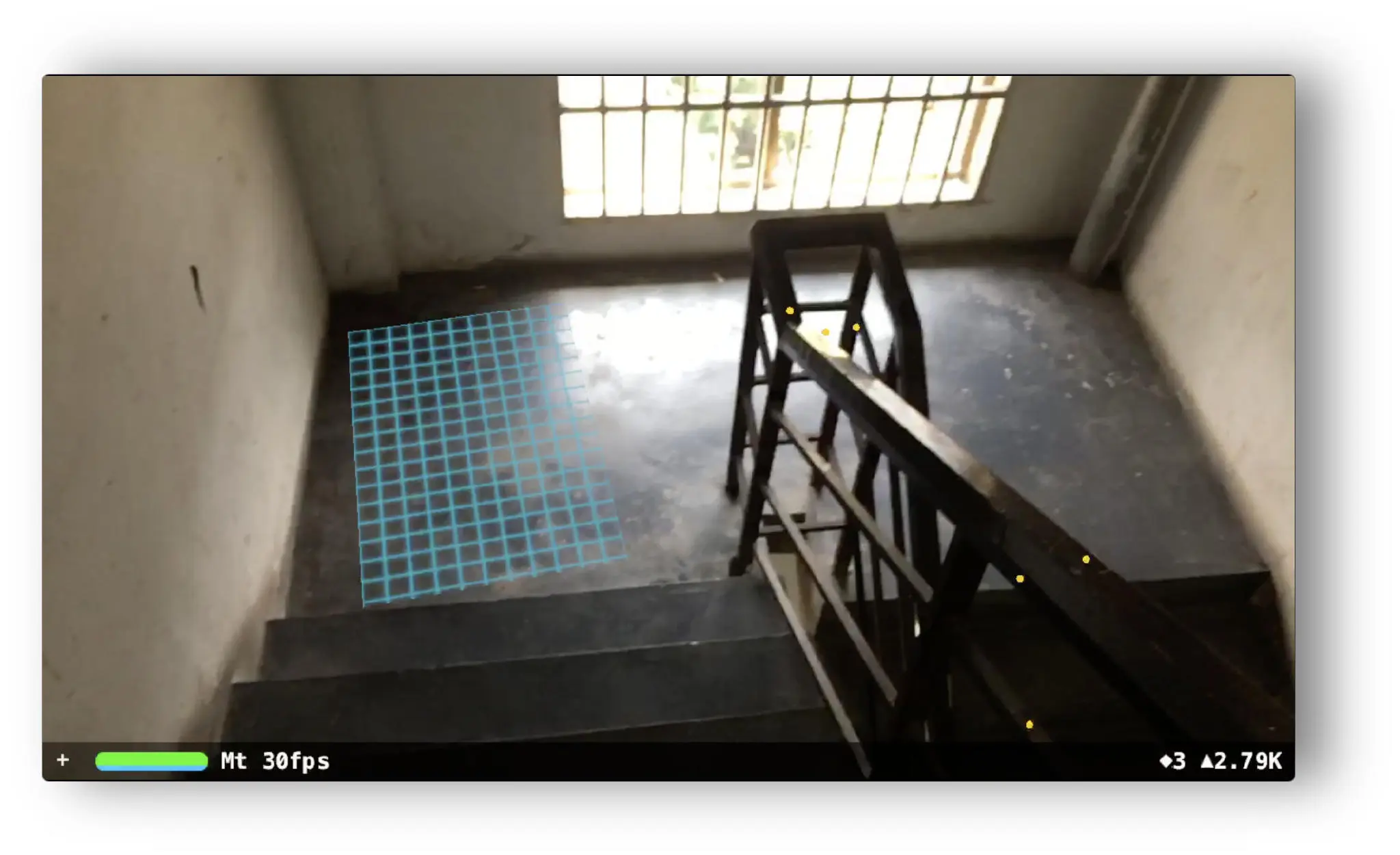 这儿很有意思,因为我站在这层楼梯的上一层,距离有3米远并且光线不好,但 ARKit 还是找出来这个平面,好厉害!