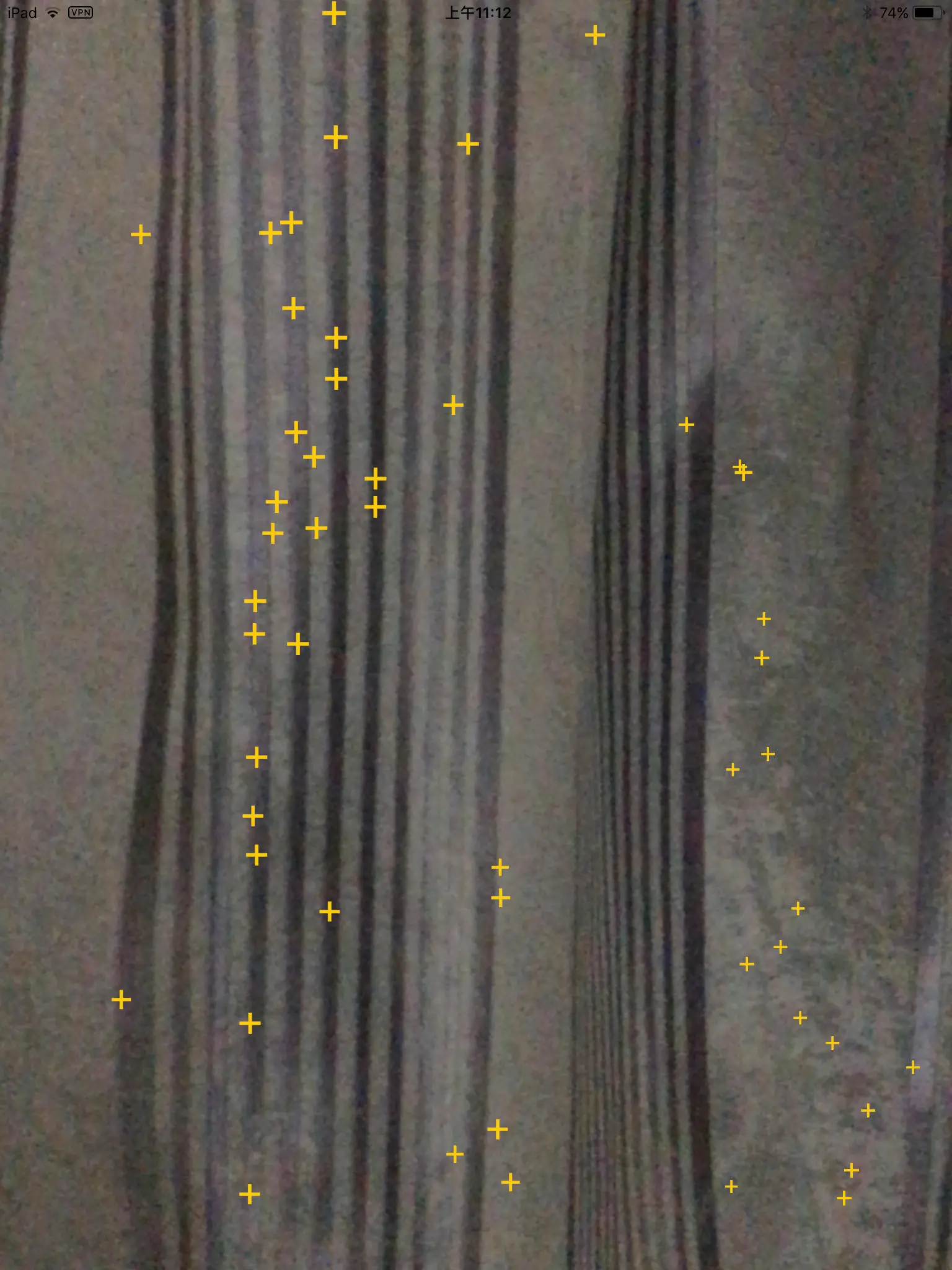 下面是我的 iPad 看向窗帘时的截图。可以看到织物有良好的纹理,所以追踪到了大量的唯一特征,每个十字都是 ARKit 找到的唯一特征。