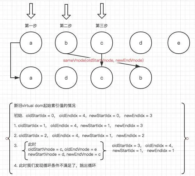 由上图我们发现,当该层级dom发生改变需要移动时,操作的是真实的dom节点,而新旧的virtual dom并没有发生变化,包括insertBefore操作,它的referenceNode都是在oldEndIdx.elm中获取的,因为可能newEndIdx的下一个节点不存在了,当跳出循环后,旧virtual dom中多余的节点(例如上图中的e)会被remove;新的virtual dom中新增的会被addVnode。