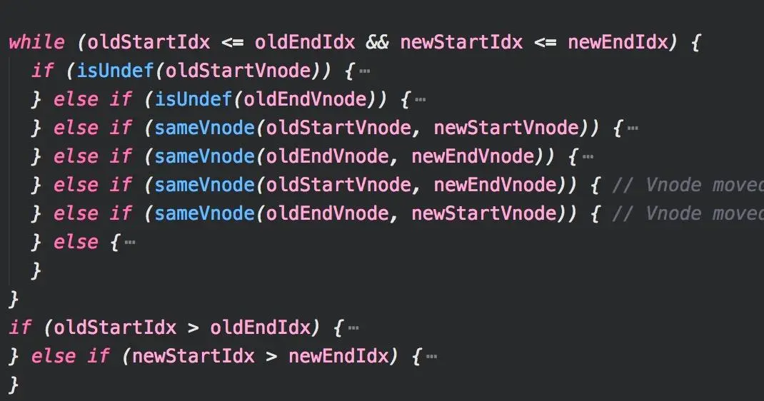 深度优先遍历会最先比较其子节点updateChildren,源码很长,也是理解中的难点,折叠其代码后,发现其比较的过程也就分为6种情况,这里的diff算法其实就是对一个列表的比较,vue只做了这几种情况的比较,也就满足了同层级的dom操作的绝大部分情况。