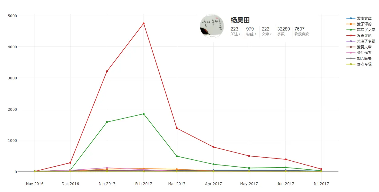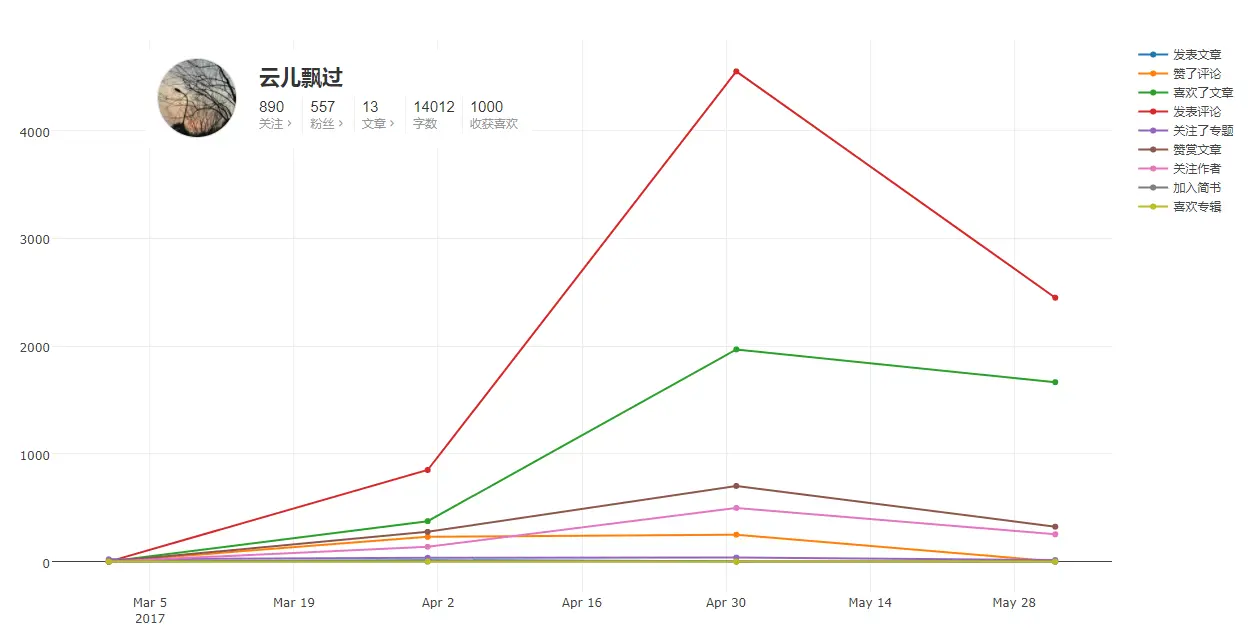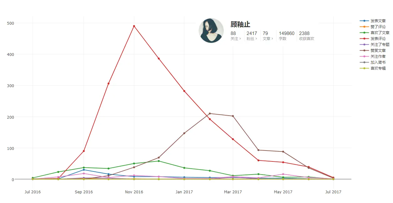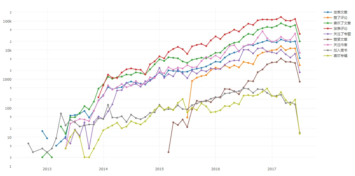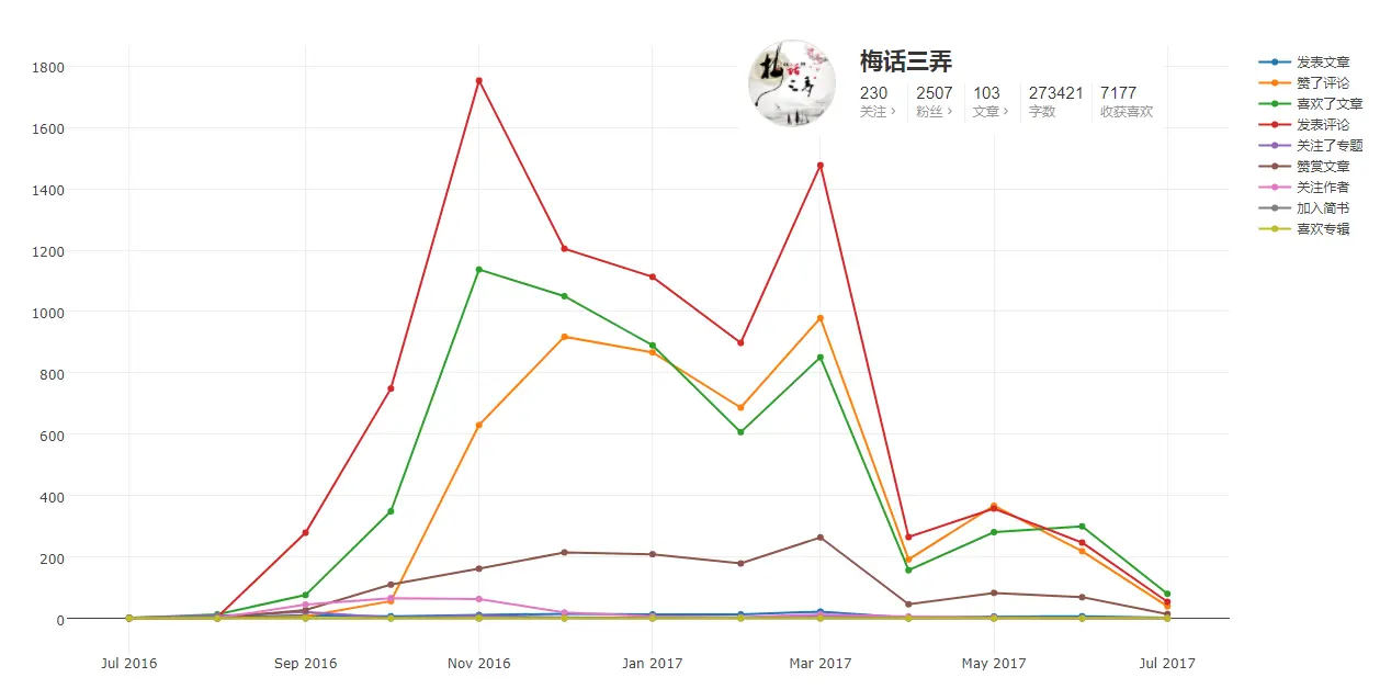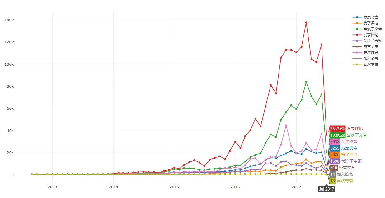 - 所有动态的年月变化趋势,喜欢文章、发表评论和赞赏文章的趋势基本一致,可以看出简书身为创作者社区,发文与阅读的比例还是很高的: