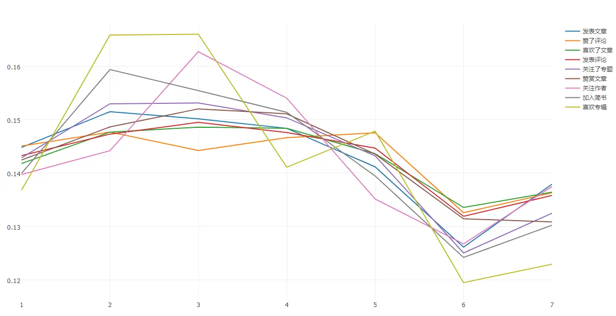 换一种看法,动态在一周内的占比分布,星期六有个较明显的下降趋势,但还是区别不大: