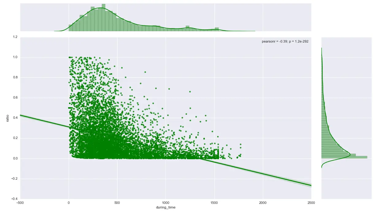 用户的简书入住总天数(横轴)与活跃比率(纵轴)的相关性分析,老用户的活跃度要低些,新用户正是热情高涨。