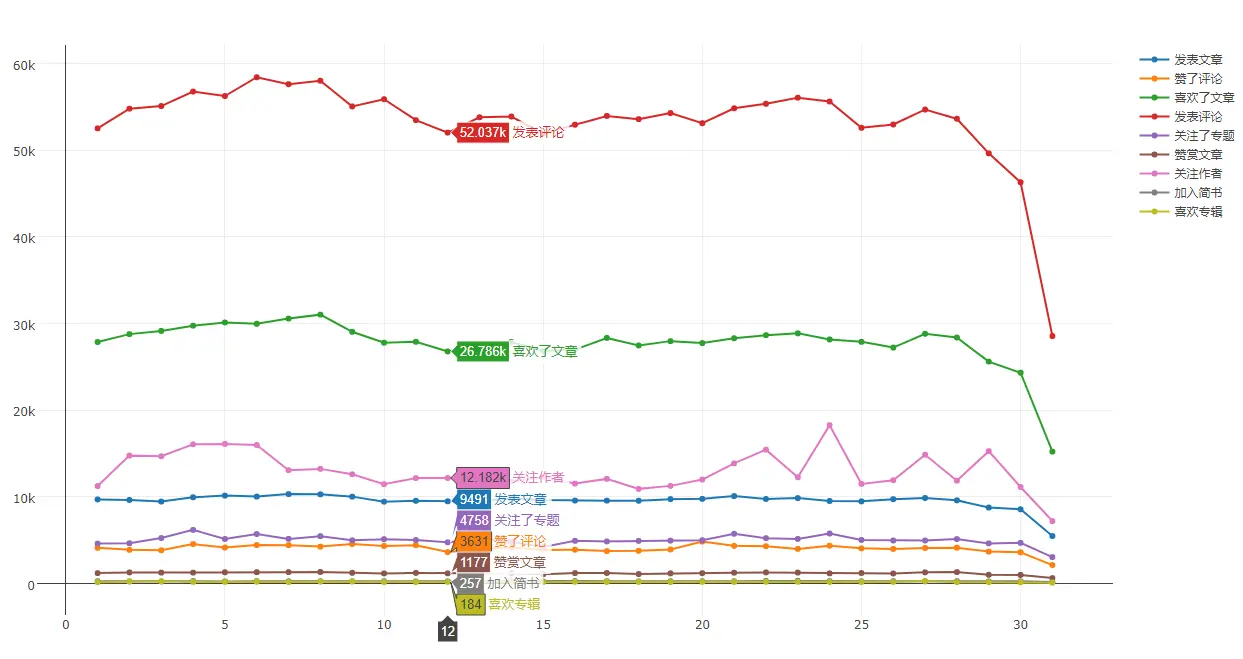 所有动态以月为周期按日取和统计,月末有个小下降,但31号的异常是因为某些月份没有31号: