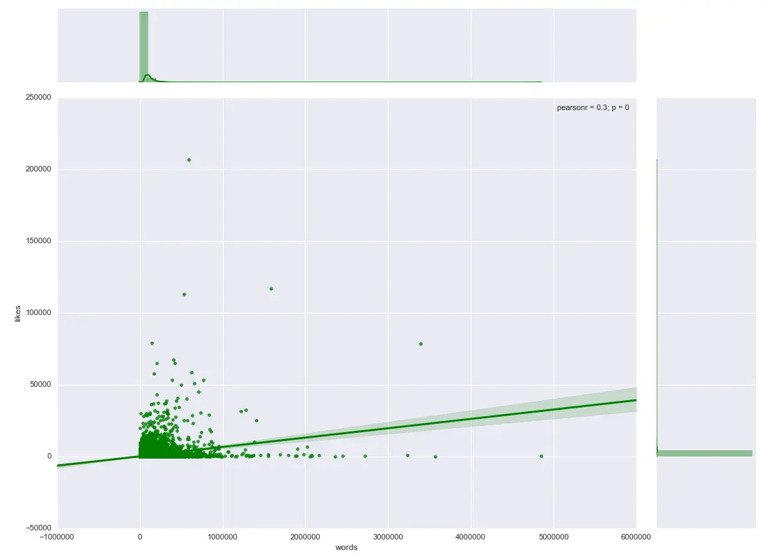 普通坐标轴,喜欢数大于100的用户分布,横轴为总字数,纵轴为总喜欢数,颜色代表关注者多寡: