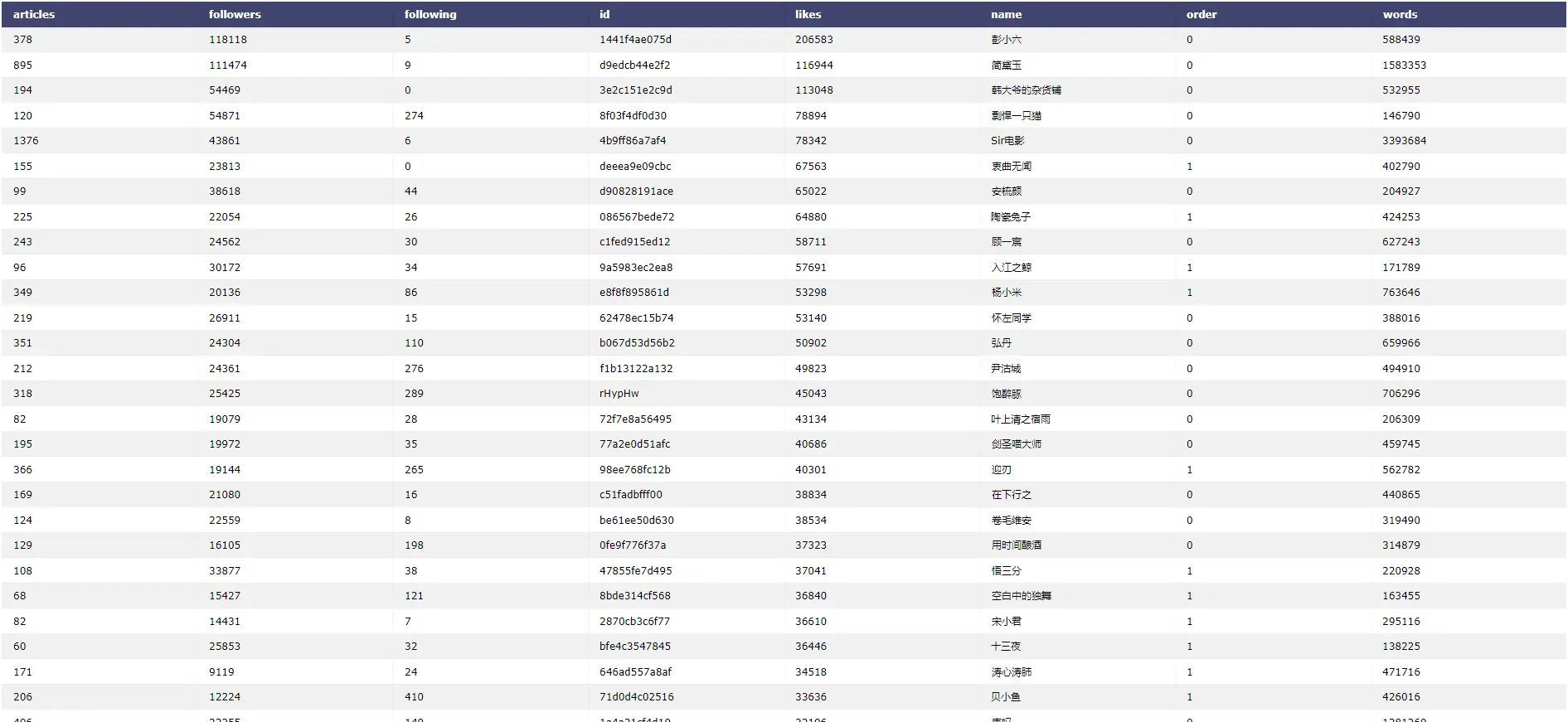 columns = ['articles', 'followers', 'following', 'likes', 'words', 'order']