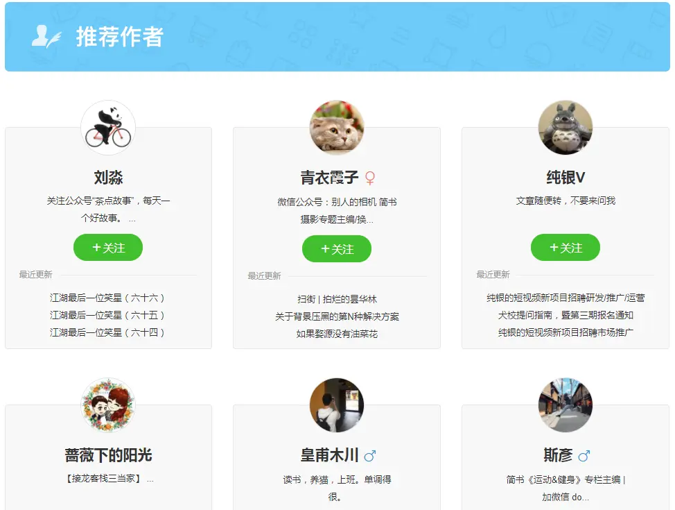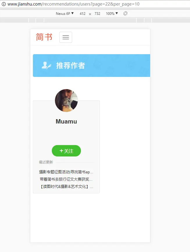 简书首页右下角有推荐作者的入口,点击查看全部跳转到如下网页: