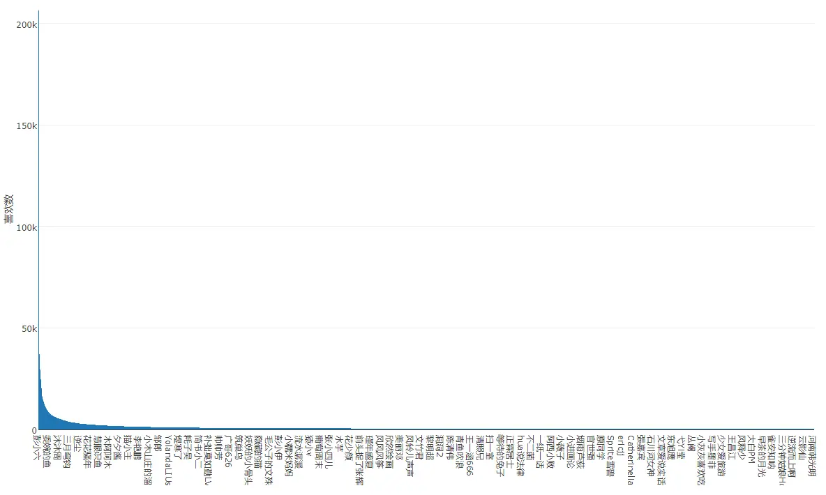 将用户按喜欢数排序后选取喜欢数大于100的用户画柱状图,可以看出喜欢数的差异十分巨大,头部作者拥有大量的喜欢数: