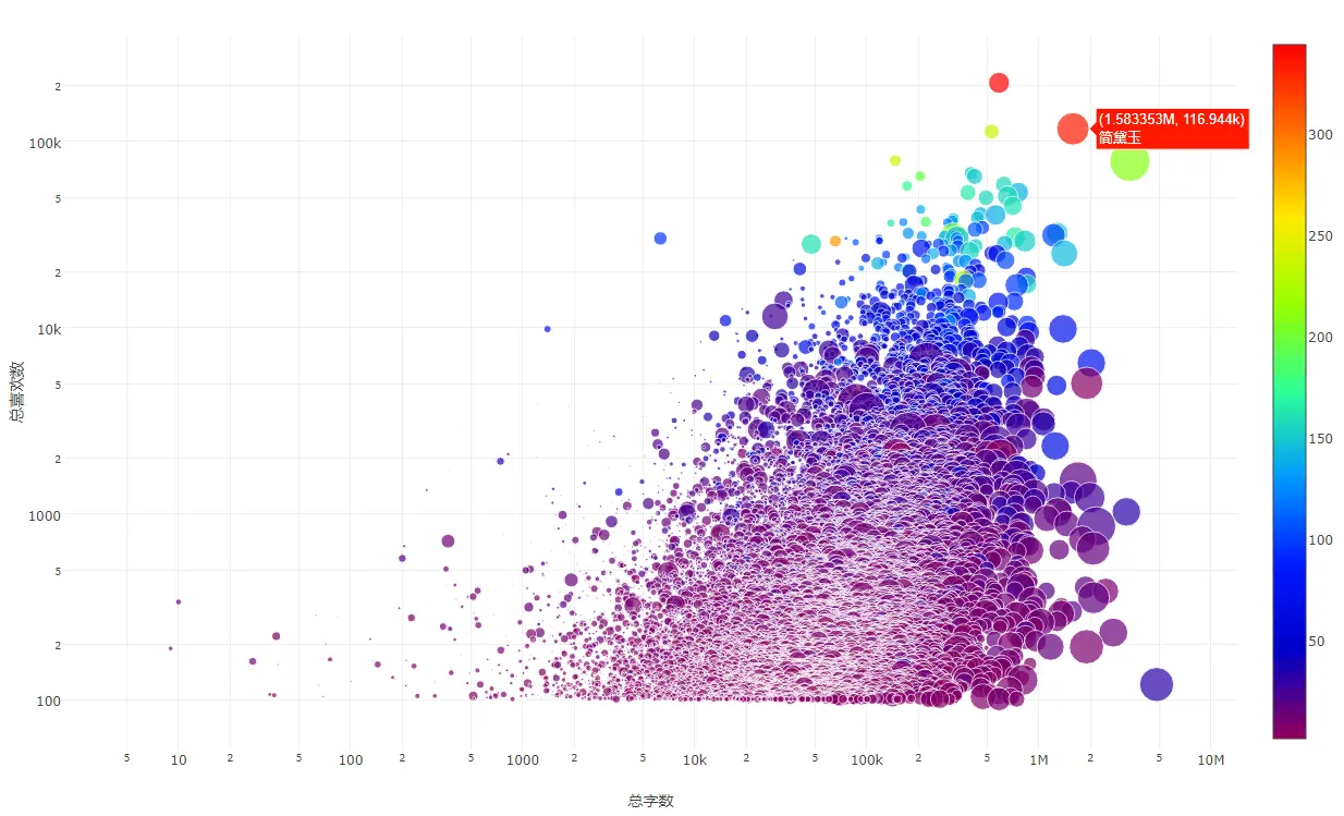 喜欢数大于100的用户分布,横轴为总字数,纵轴为总喜欢数;点的颜色越红,关注者越多,颜色数值为关注者数量的开平方;点的形状越大,文章数量越多: