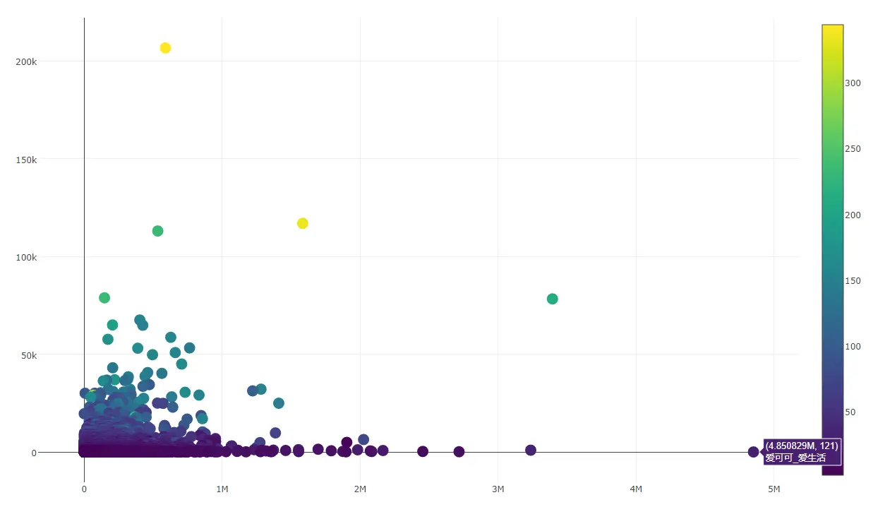 喜欢数大于100的用户分布,横轴为总字数,纵轴为总喜欢数;颜色越往红入口层级越前;点的形状越大,关注者越多:
