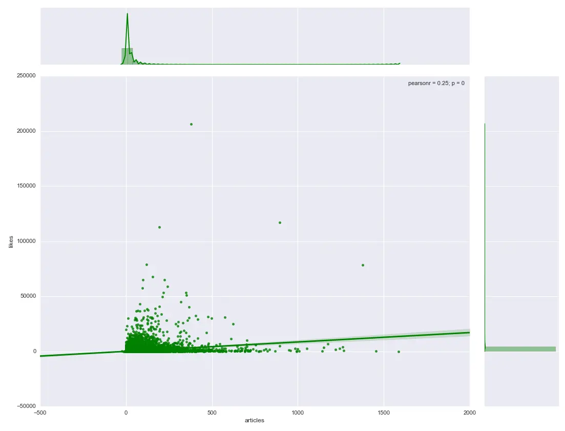 sns.jointplot(data=all_users, x='articles', y='likes', kind='reg', color='g')