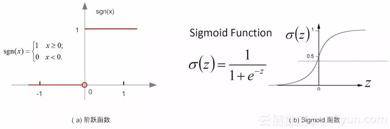 因此,我们通常用 Sigmoid 函数(如图3- 5 - b )所示)来代替阶跃函数。这个函数可以把较大变化范围内输入值( x )挤压输出在( 0,1 )范围之内,故此这个函数又称为“挤压函数( Squashing function )”。