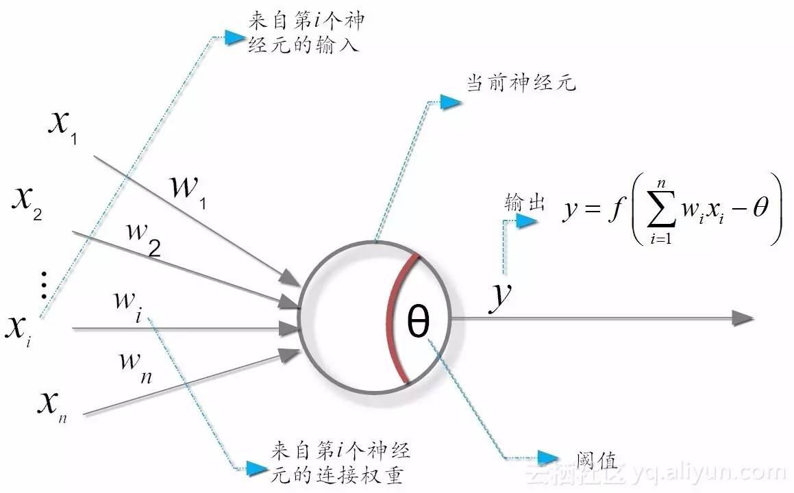 在这个模型中,神经元接收来自 n个其它神经元传递过来的输入信号,这些信号的表达,通常通过神经元之间连接的权重( weight)大小来表示,神经元将接收到的输入值按照某种权重叠加起来,并将当前神经元的阈值进行比较,然后通过“激活函数( activation function)”向外表达输出(这在概念上就叫感知机),如图3- 2所示。