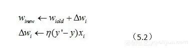 如此一来,感知机的学习规则就可以更加简单明了,对于训练样例( x ,y )(需要注意的是,这里粗体字x 表示训练集合),若当前感知机的实际输出 y’,假设它不符合预期,存在“落差”,那么感知机的权值依据如公式( 5.2)规则调整: