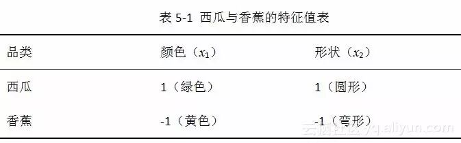 为了方便机器计算,我们对颜色和形状这两个特征,给予不同的值,以示区别。比如,颜色这个特征为绿色时,x 1取值为1 ,而当颜色为黄色时,x1 取值为-1;类似地,如果形状这个特征为圆形, x2 取值为1,反之,形状为弯曲状时, x2 取值为-1,如表 5-1所示。