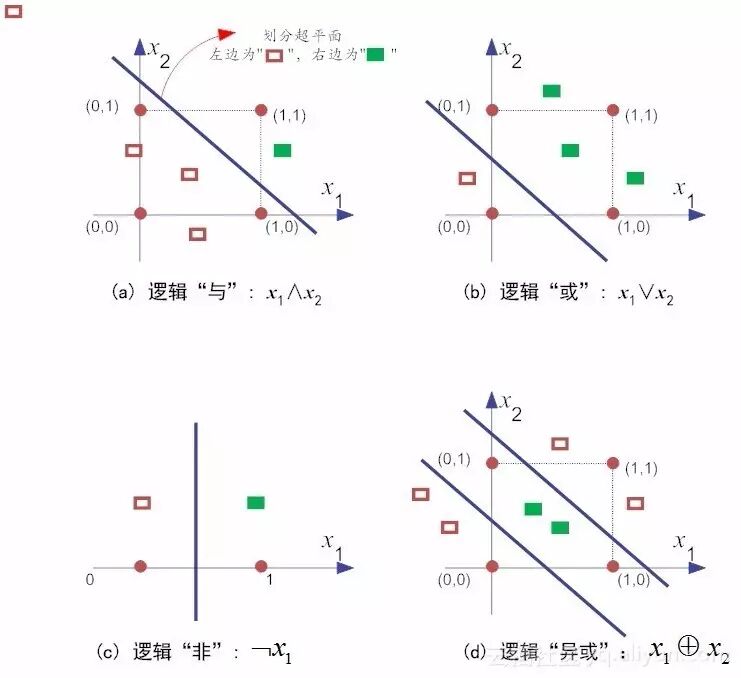 图 5-6 线性可分的“与、或、非”和线性不可分的“异或”