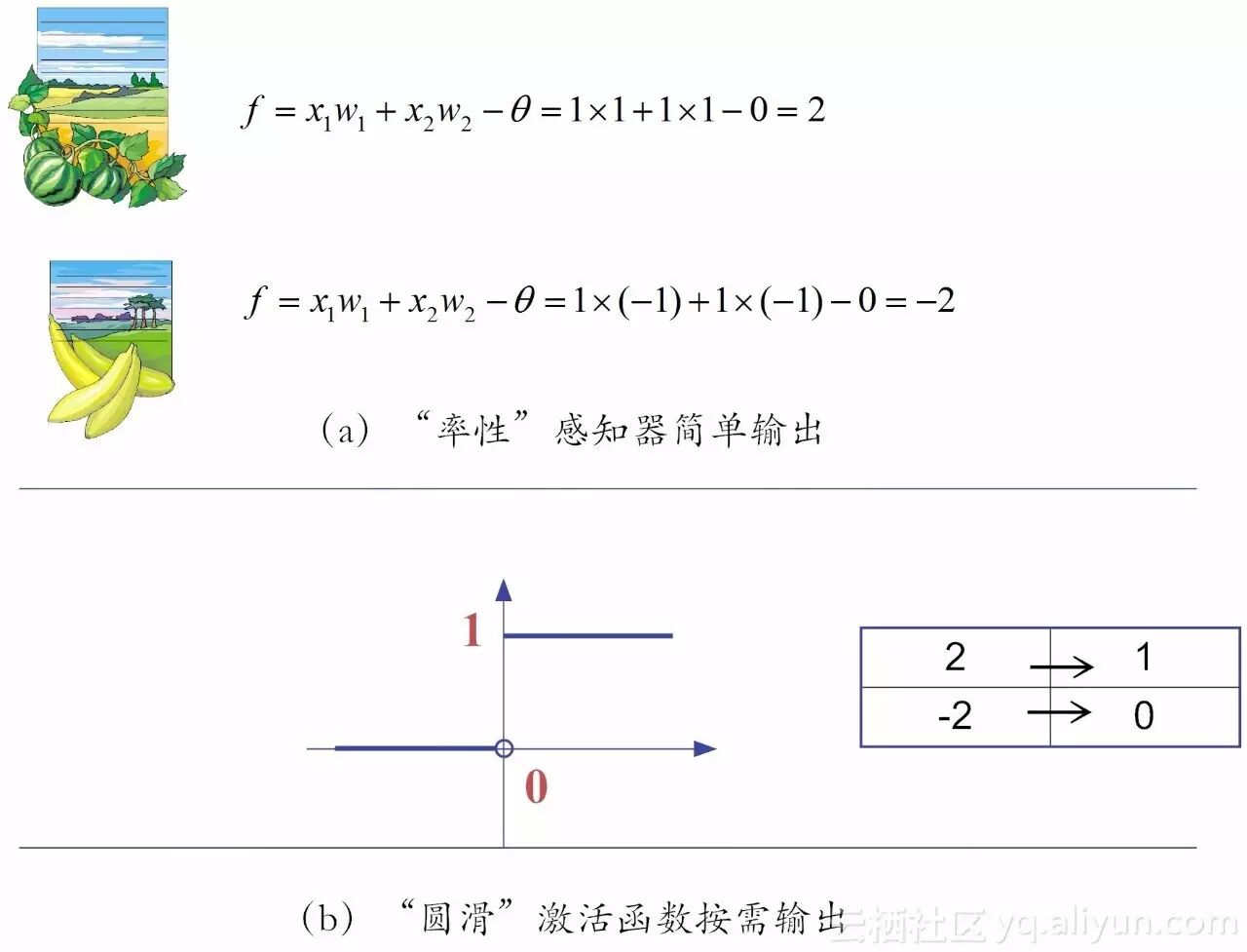 这样一来,可以很容易依据图5-1 所示的公式,对于西瓜、香蕉做鉴定(即输出函数f 的值),其结果分别如图5-2( a)所示: