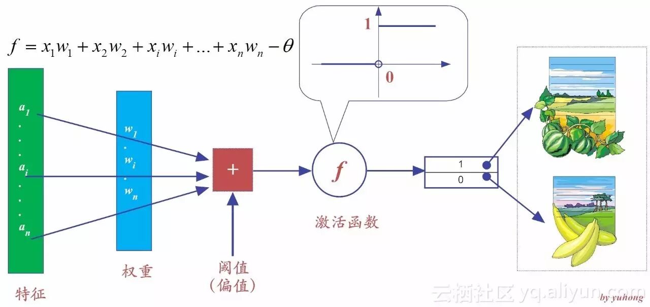 假设特征x 1代表输入颜色,特征x 2代表形状,权重w 1和w 2默认值都为1 ,为了进一步简化,我们把阈值θ(亦有教程称之为偏值——bias)设置为 0。为了标识方便,我们将感知器输出为“1”,代表判定为“西瓜”,而输出为“ 0”,代表判定为“香蕉”。当然了,如果有更多类别的物品,我们就用更多的数字来标记即可。