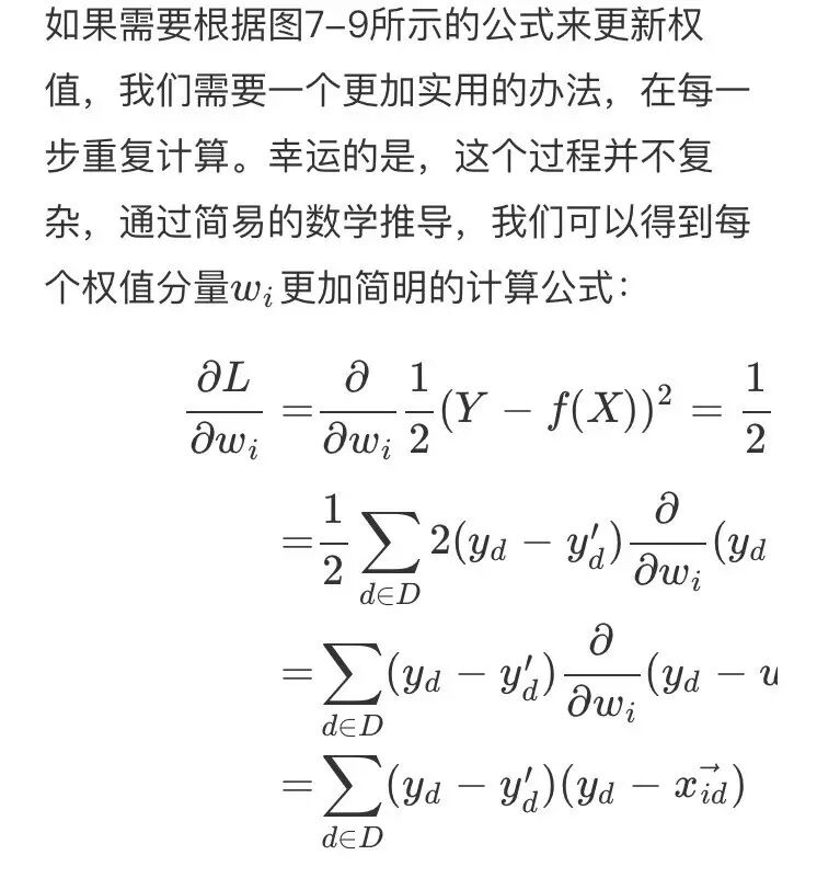 在我们训练神经网络时,损失函数说白了,就是有关“权值参数”的函数。为了求损失函数的极小值,就不可避免地需要计算损失函数中每一个权值参数的偏导数,这时前文中提到的“梯度递减”方法就派上用场了。训练线性单元的梯度递减算法示意图如图7-9所示,图中的参数η就是“学习率”,它决定了梯度递减搜索的步长,这个步长“过犹不及”。如果值太小,则收敛慢,如果值太大,则容易越过极值,导致网络震荡,难以收敛。