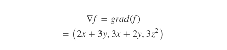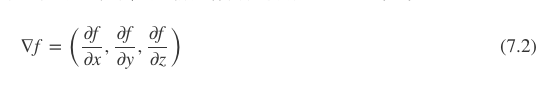 在向量微积分中,标量场的梯度其实是一个向量场(vector filled)。对于特定函数的某个特定点,它的梯度就表示从该点出发,该函数值增长最为迅猛的方向(direction of greatest increase of a function)[6]。假设一个标量函数f的梯度记为: f f或 grad f g r a d f,这里的表示向量微分算子。那么,在一个三维直角坐标系,该函数的梯度就可以表示为公式(7.2):