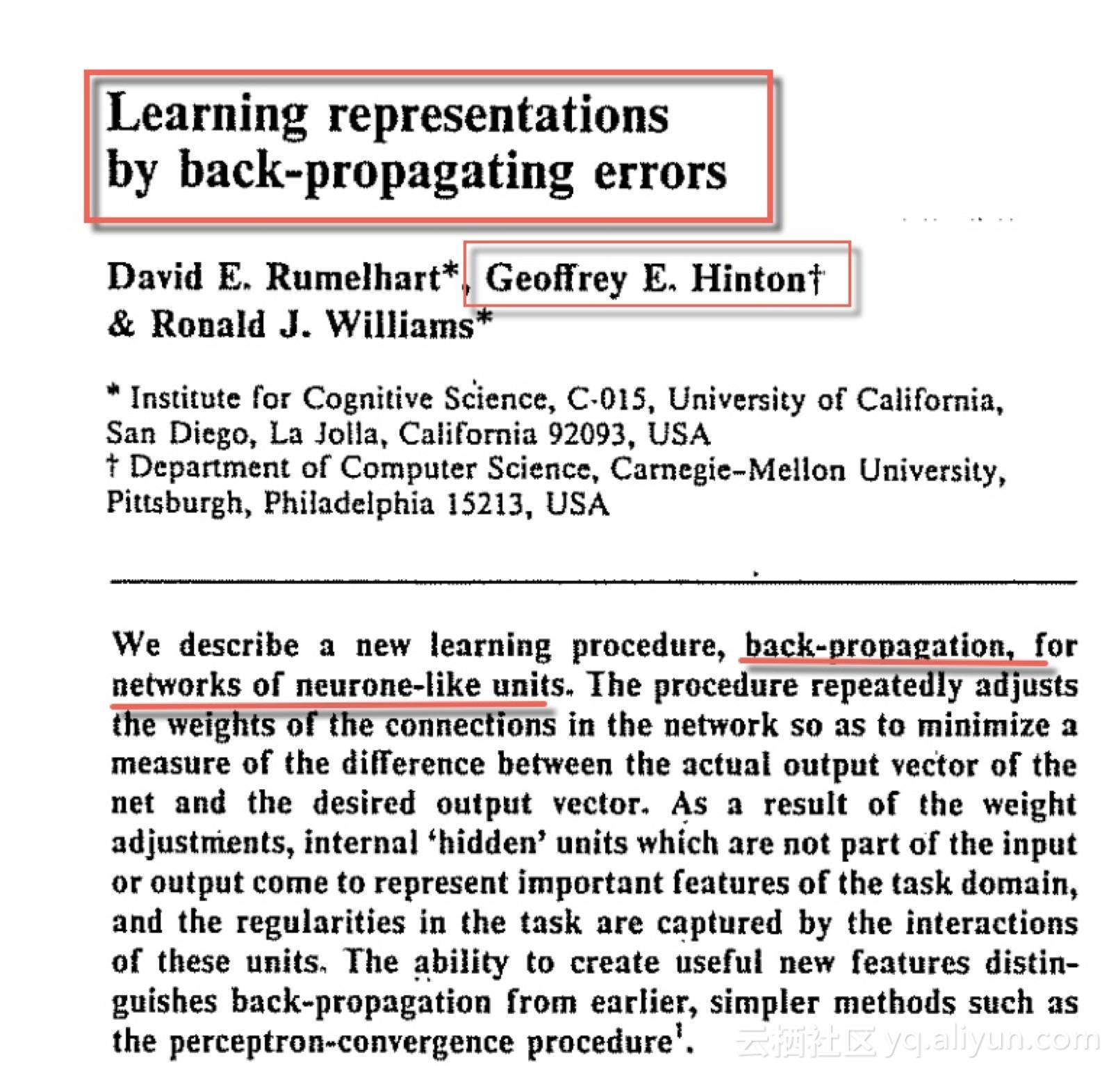 1986年10月,杰弗里•辛顿还在卡内基梅隆大学任职。他和在加州大学圣迭戈分校的认知心理学家大卫·鲁梅尔哈特(David Rumelhart)等人,在著名学术期刊《自然》上联合发表题为:“通过反向传播算法的学习表征(Learning Representations by Back-propagating errors)”的论文[3]。该文首次系统简洁地阐述反向传播算法(BP)在神经网络模型上的应用,该算法把网络权值纠错的运算量,从原来的与神经元数目的平方成正比,下降到只和神经元数目本身成正比。