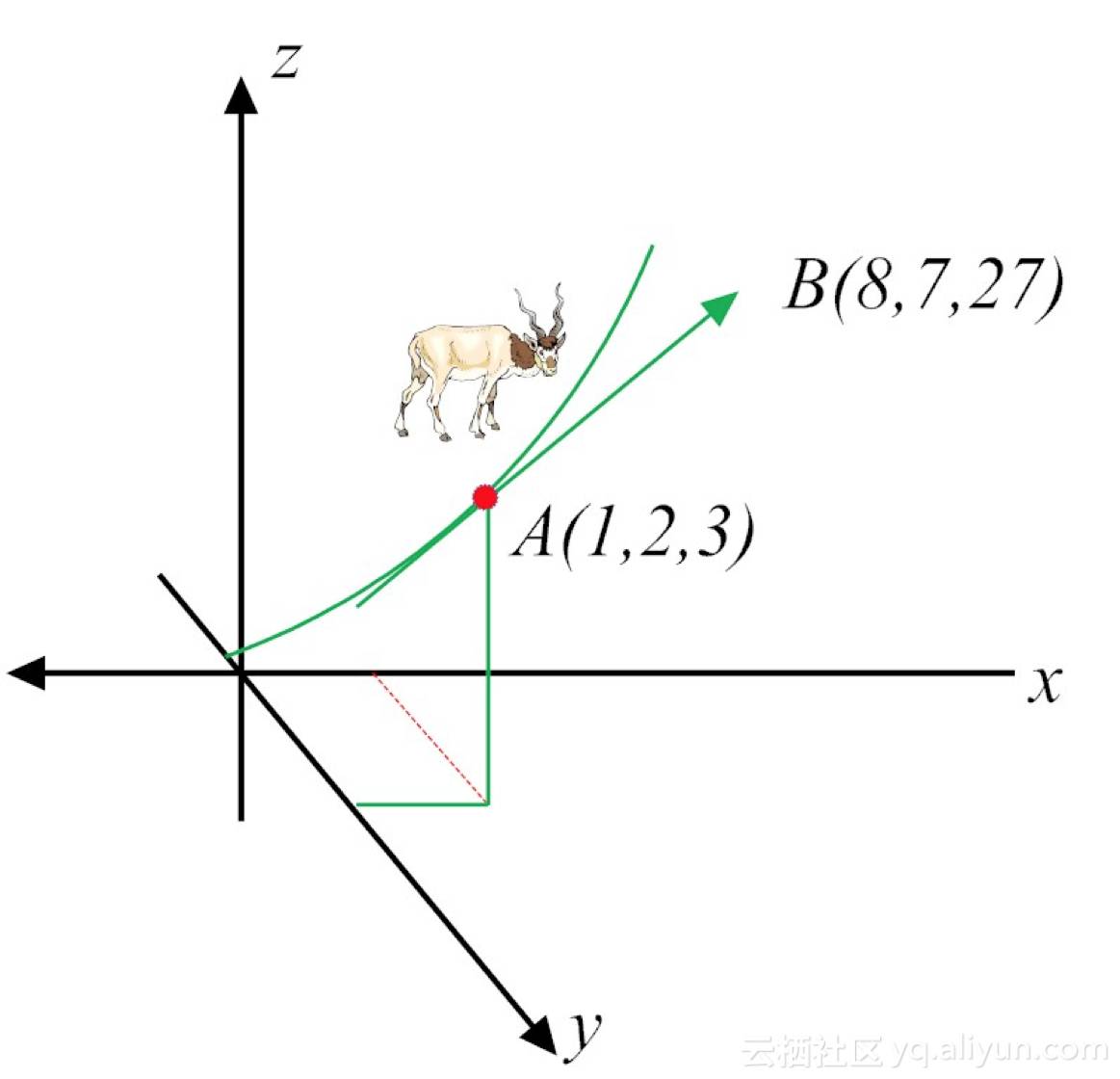 这时,梯度可理解为,站在向量点A(1, 2, 3),如果想让函数f的值增长得最快,那么它的下一个前进的方向,就是朝着向量点B(8,7,27)方向进发(如图7-3所示)。很显然,梯度最明显的应用,就是快速找到多维变量函数的极(大/小)值。