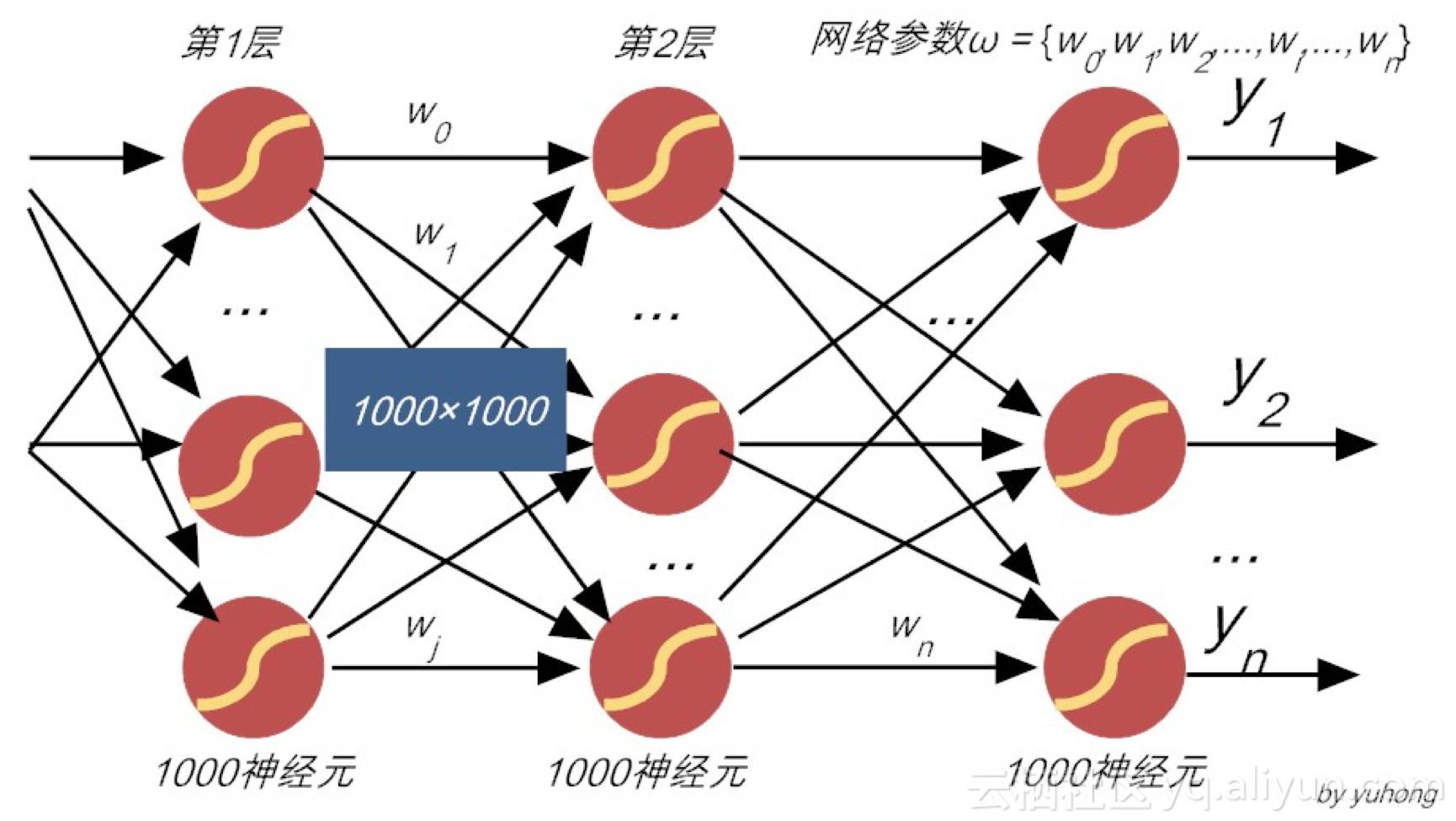 但这中暴力策略,对稍微复杂一点的网络就不可取了!例如,用于语音识别的神经网络,假设网络结构有7层,每一层有1000个神经元,那么仅一层之间的全连接权值,就达到1000×1000=1061000×1000=106个,一旦层次多了,那权值数量就海了去了!(如图7-4所示)。故此,这种暴力调参找最优参数,既不优雅,也不高效,故实不可取!