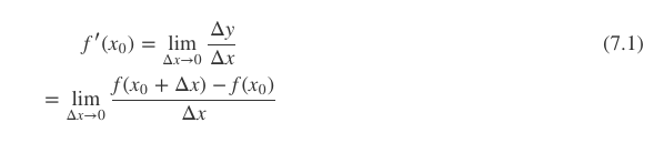 我们知道,求某个函数的极值,难免就要用到“导数”等概念。既然我们把这个系列文章定位为入门层次,那不妨就再讲细致一点。什么是导数呢?所谓导数,就是用来分析函数“变化率”的一种度量。针对函数中的某个特定点x0,该点的导数就是x0点的“瞬间斜率”,也即切线斜率,见公式(7.1)。
