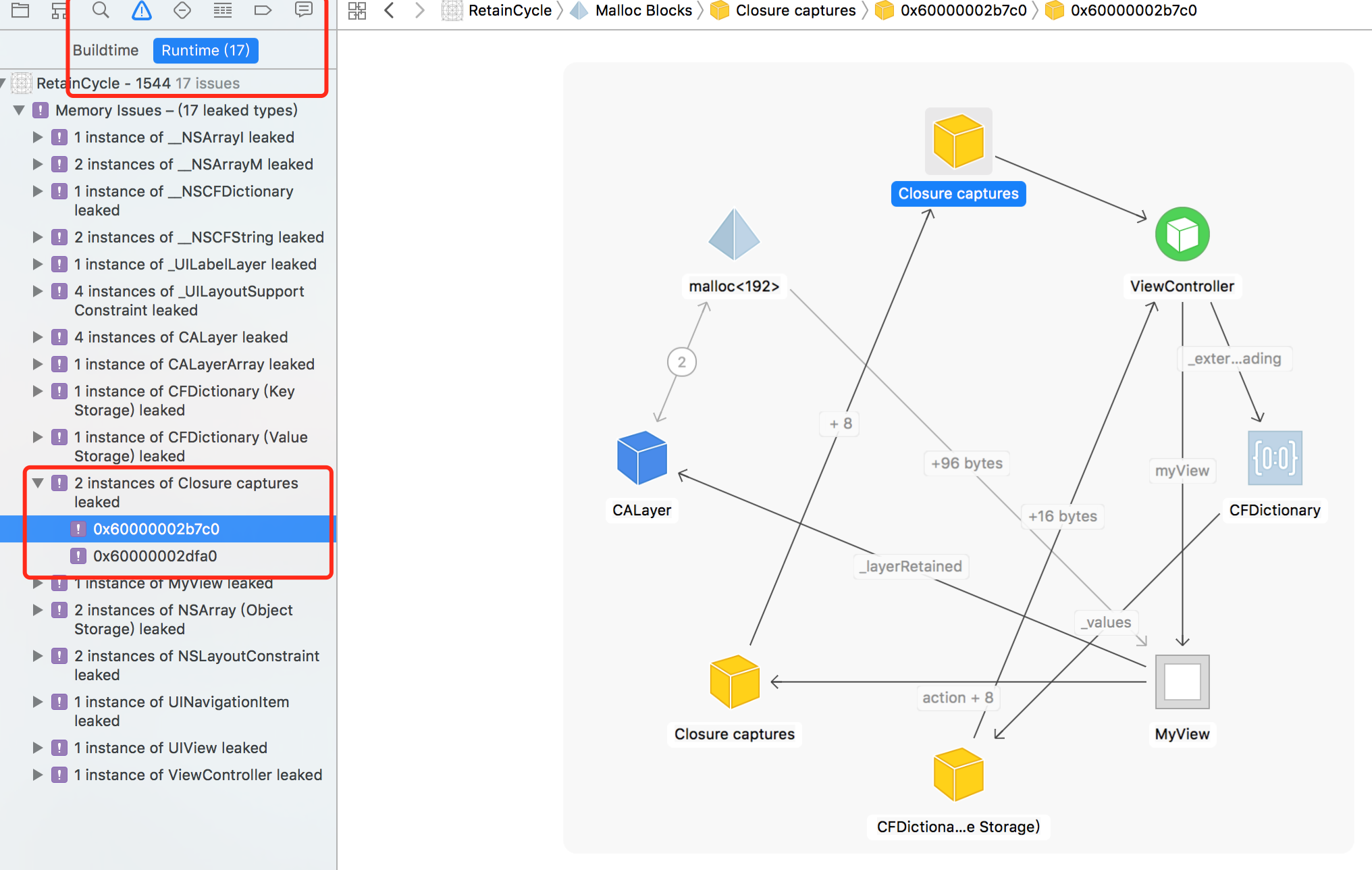 有很多叹号说明就有问题了。看内存中object的名字,有一条是Closure captures leaked。展开后点击就可以看到这个issue对应的内存图形展示在中间的面板中。