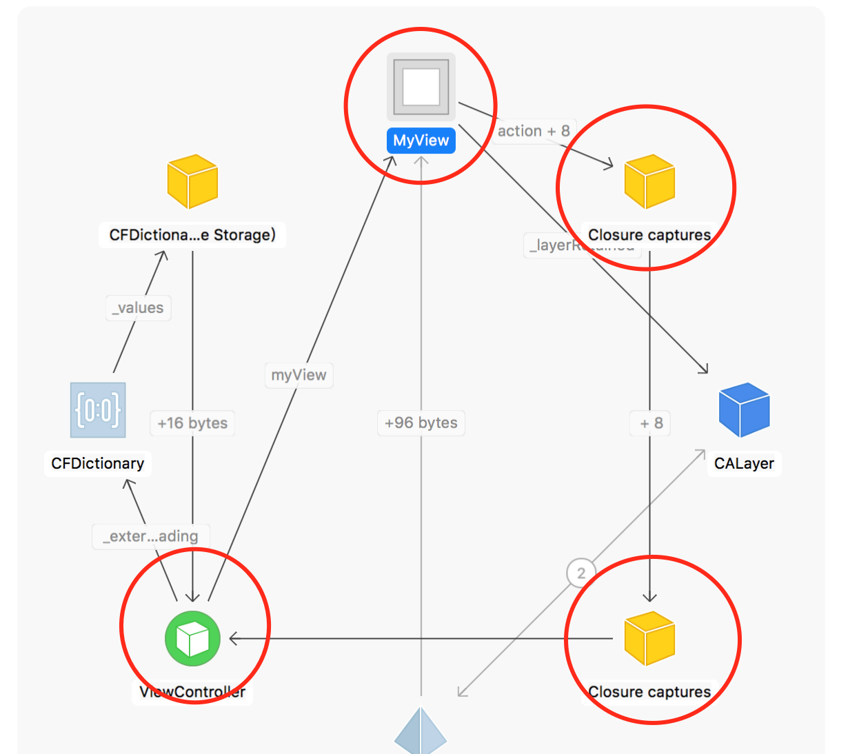 有了这个图就很容易看出来了:myView保持了action,action保持了testMethod,testMethod中因为设置了vc的label所以也保持了VC。所以我们可以确定:方法中隐式的self的捕捉策略是strong。这样直接把方法传入子view中会引起引用循环。