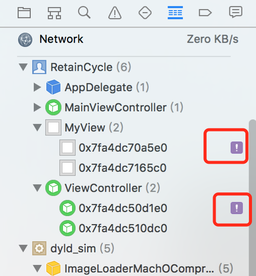 注意到我们刚才的对象名:一个叫MyView,一个叫ViewController。我们pop了两次,按理说内存里不应该有这个两个对象,然而还是有两份实例。所以,这里面引用循环了。点击紫色的叹号会出现Xcode分析出来的内存引用图形:
