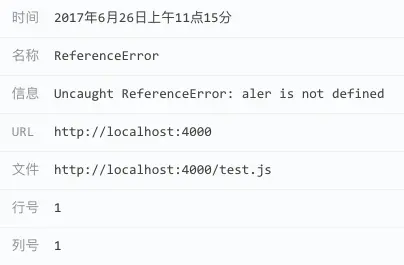 下面的示例中,alert被写成了aler,因此会报ReferenceError: