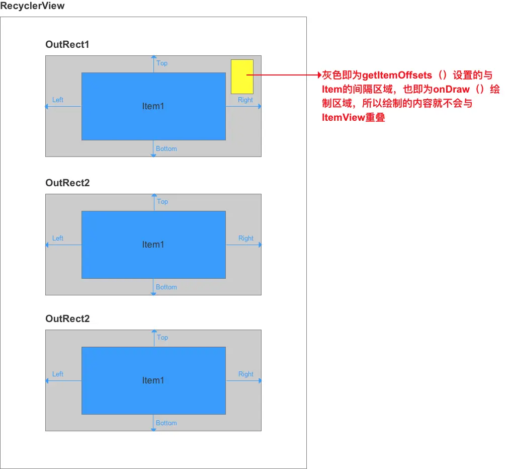 RecyclerView中的 ItemView 外面会包裹着一个矩形(outRect) - 内嵌偏移长度 是指:该矩形(