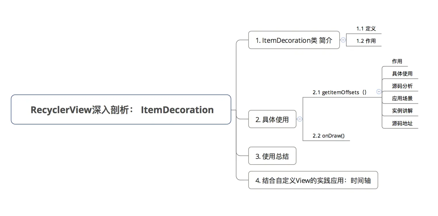 ItemDecoration类,包括ItemDecoration类简介、使用方法 & 实例讲解,最终结合 自定义View实现 时间轴UI开发,希望你们会喜欢。-