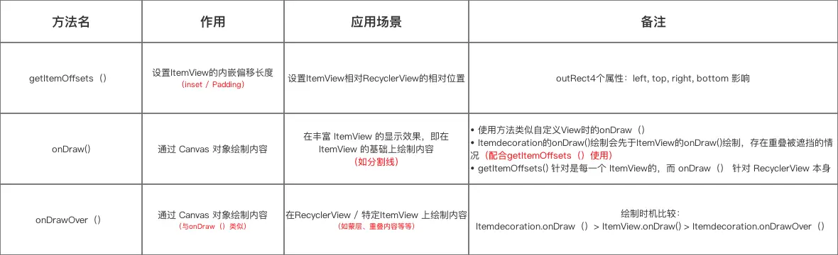 ItemDecoration类中仅有3个方法,具体如下: