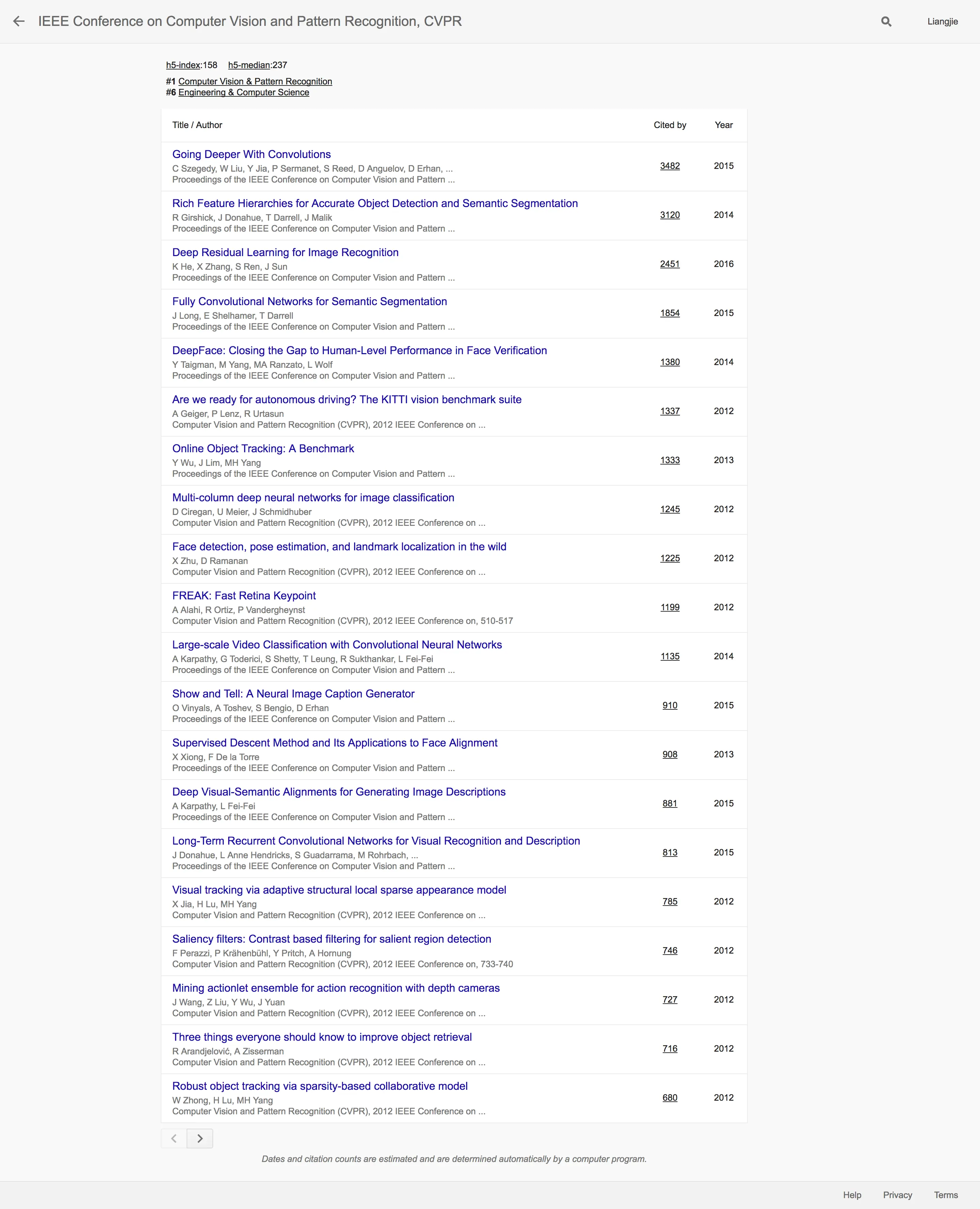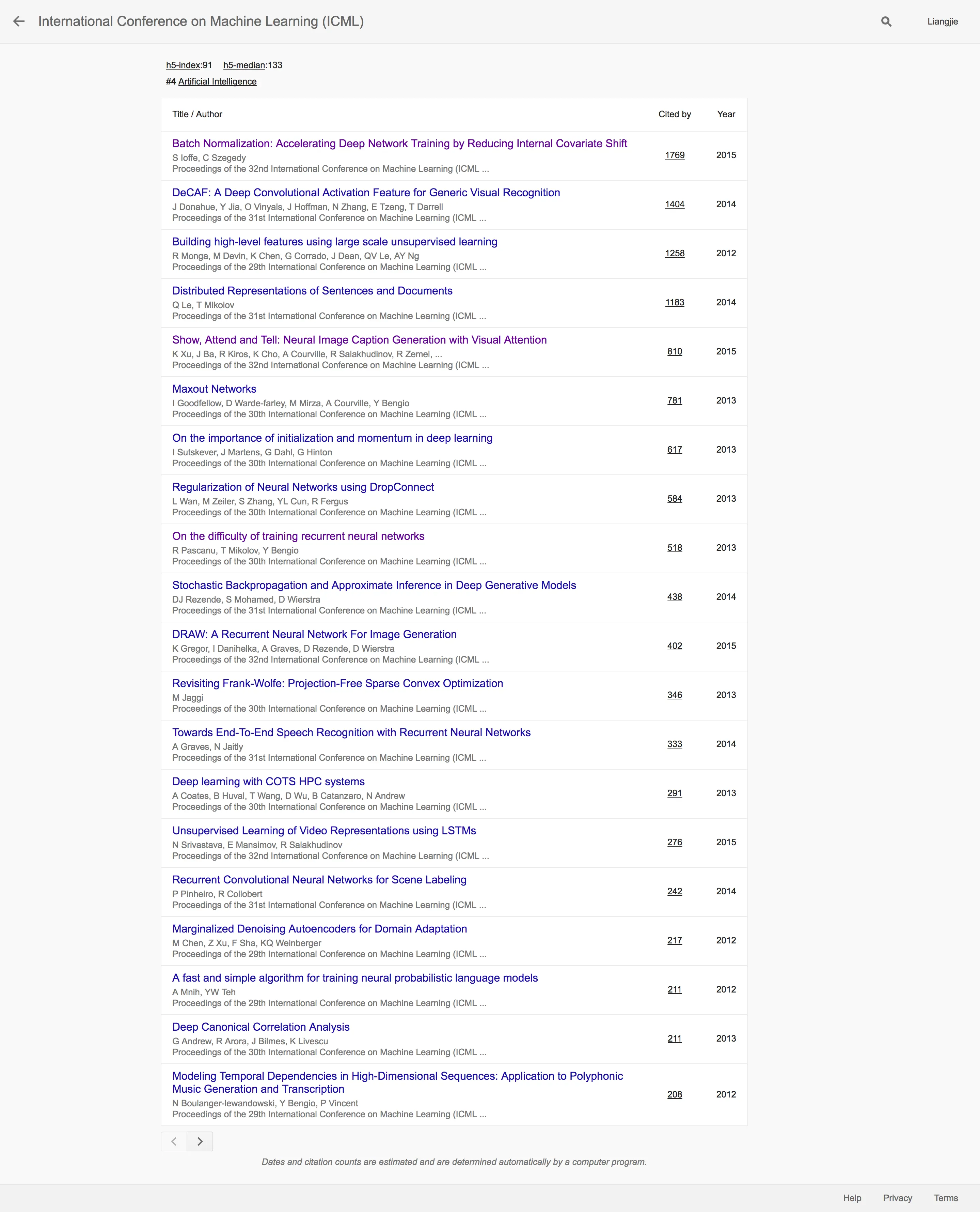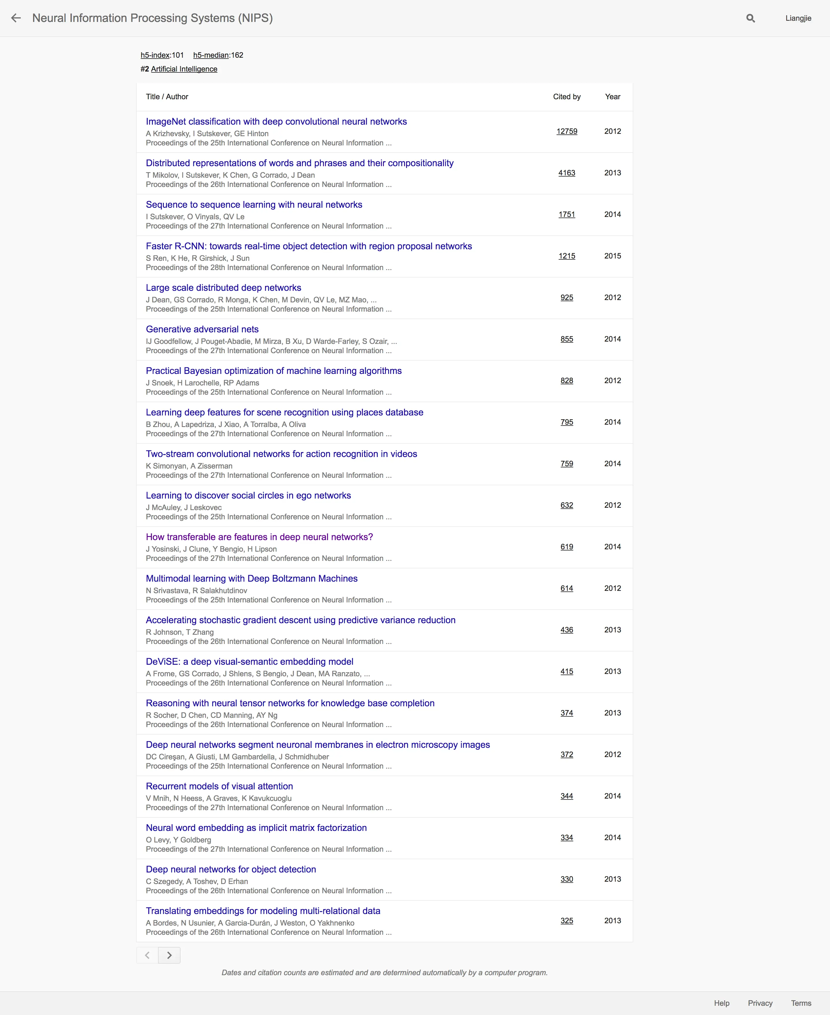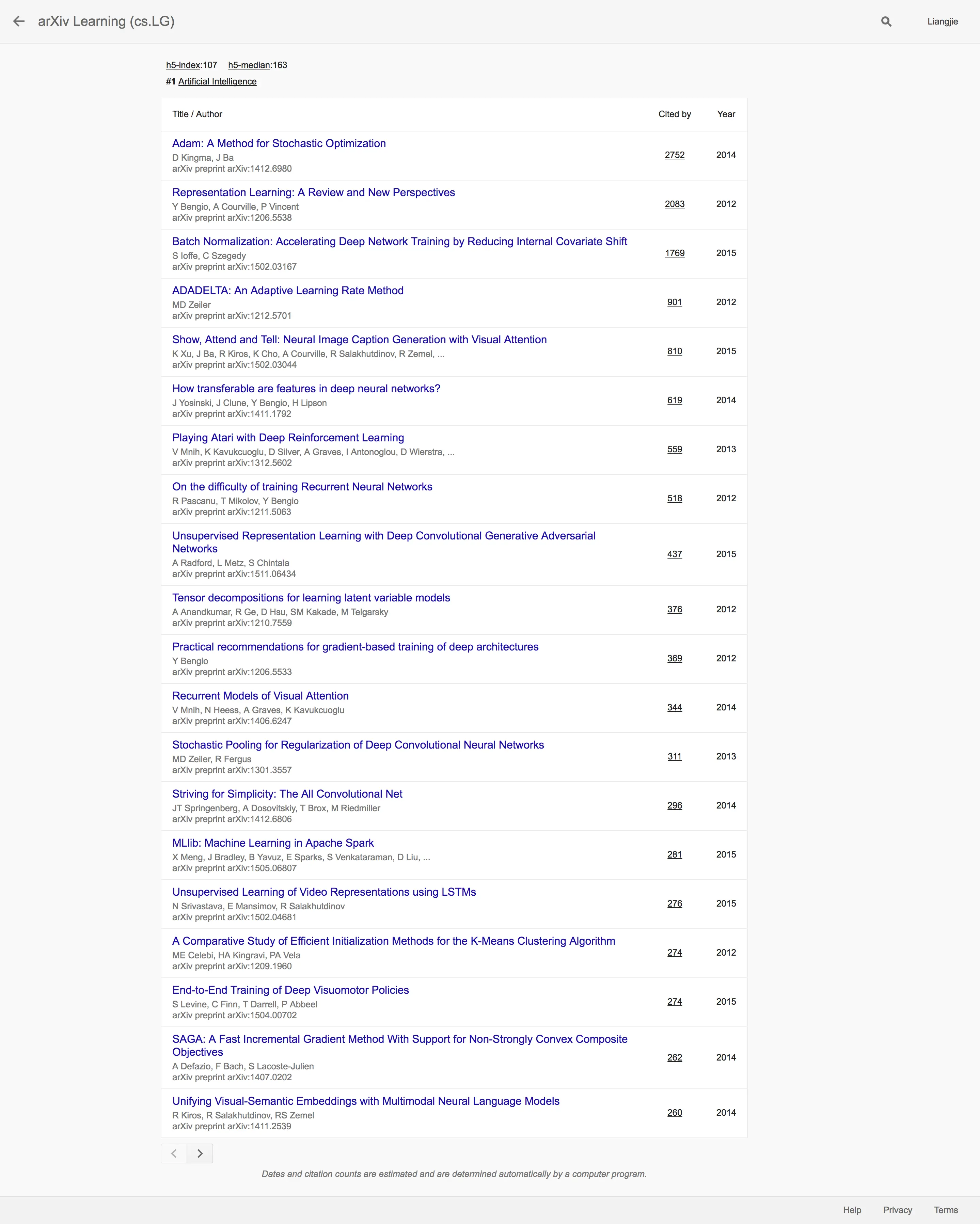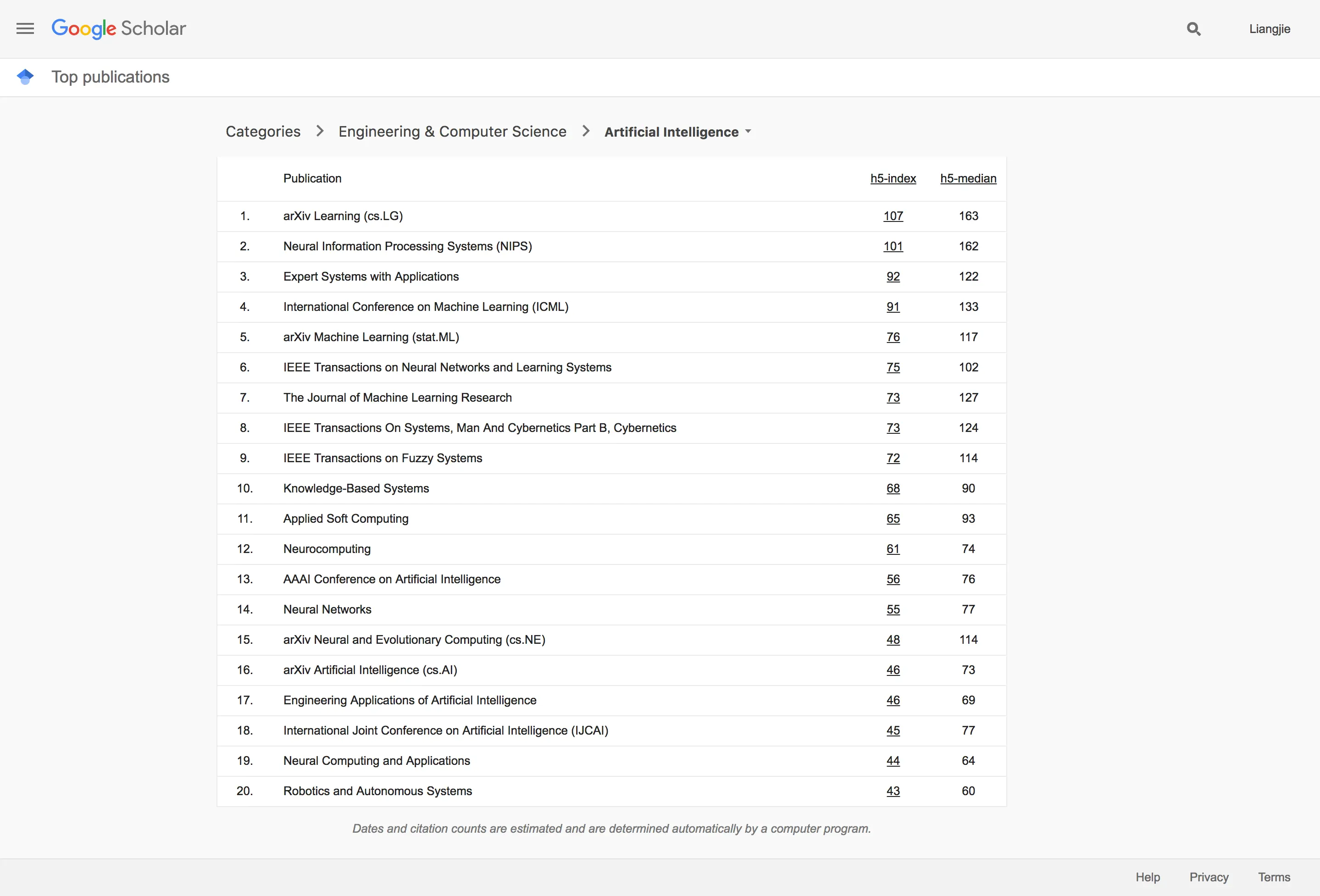 Google Scholar 2017学术指标之人工智能篇