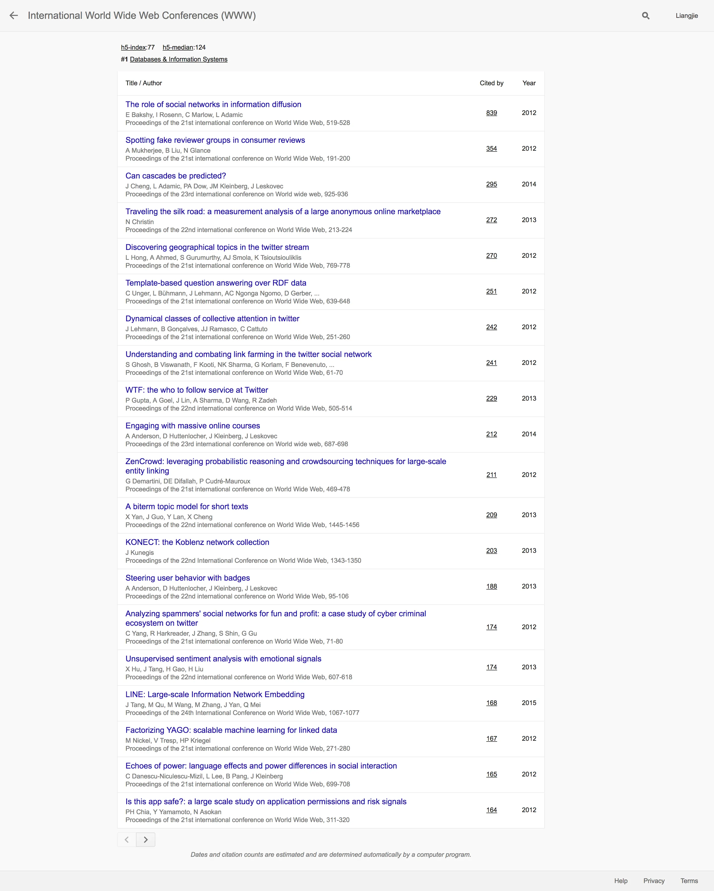 可以看出过去5年来,关于Social Media(以Twitter为主)和关于Social Network Analysis的相关研究还是如火如荼。而纵观KDD和WWW都可以看到斯坦福大学的明星学者Jure Leskovec的强大存在。