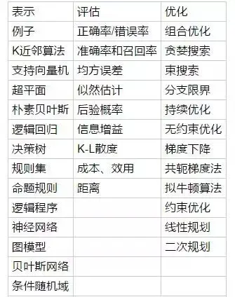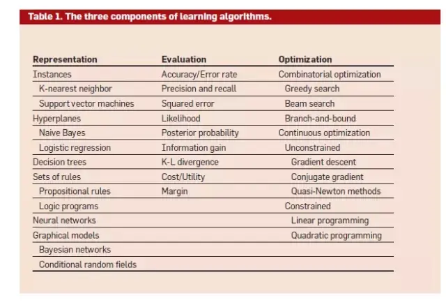 优化:最后,我们需要一个方法来找到分数最高的分类器。优化技术对于提升学习器效率至关重要,如果评价函数得出了多个分类器,那么就由优化来决定最终的去留。通常来说,新的学习器开始都用现成的优化器,之后会换成定制的优化器。附表为三大成分的范例。