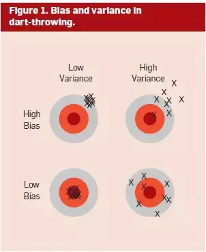 如图1所示,用飞镖做类比。一个线性学习器偏差很高,因为两个类别之间的交界不是超平面时,学习器就不能进行归纳。决策树不会发生这个问题,因为它们可以表示任何布尔函数,但是它们会出现很高的方差,由同样的现象引出的问题,在不同的数据集上训练,决策树模型会得到完全不同的结果,而理论上来说,它们应该是一样的。