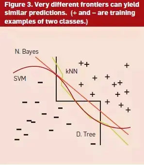 相同的问题也出现在优化方式的选择上:在选择优化算法时,束搜索比贪婪搜索有更低的偏置,但有更高的方差,因为它用到了更多的假设。因此,与我们的直觉相反,真正优秀的分类器不一定要比差的分类器表现更好。
