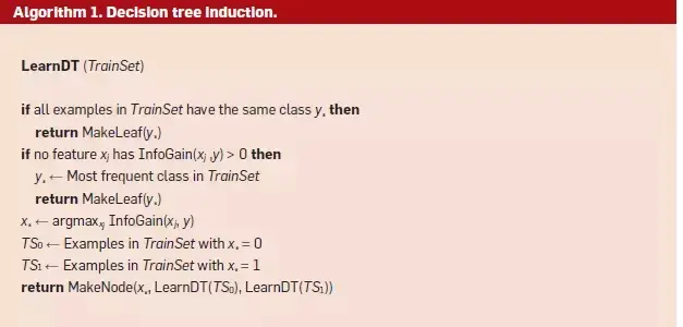 算法1就是布尔域决策树学习器的基本框架,使用了信息增益和贪婪搜索。信息增益(xj, y)是特征xj和类别y之间的互信息。节点制造(x,c0,c1)得出测试特征X 的节点值,把c0 作为x = 0的子类, c1 作为 x = 1的子类。当然,不是表格中一个成分的所有组合都有相同意义。比如,离散表示通常用组合优化,而连续表示就用连续优化。然而,很多学习器既有离散成分也有连续成分,事实上,也许不久后在一些学习器上就会有所有可能的组合了!很多教材都是按照表示来安排的,这样容易忽略其他重要的部分。选择这些没什么捷径,但落实到机器学习项目上,有些部分会更重要一些。