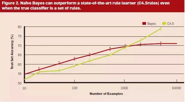 如图2所示,即使真正的分类器是规则集,在训练样本不到1000个的时候,朴素贝叶斯分类器比决策树分类器精确度更高。哪怕贝叶斯假设错误,界面是线性,准确率还是很高!这样的情况在机器学习中很常见:较强的错误假设会比较弱的正确假设表现更好,这是因为后者需要更多的数据来避免过拟合。