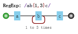 比如/ab{2,5}c/表示匹配这样一个字符串:第一个字符是“a”,接下来是2到5个字符“b”,最后是字符“c”。测试如下: