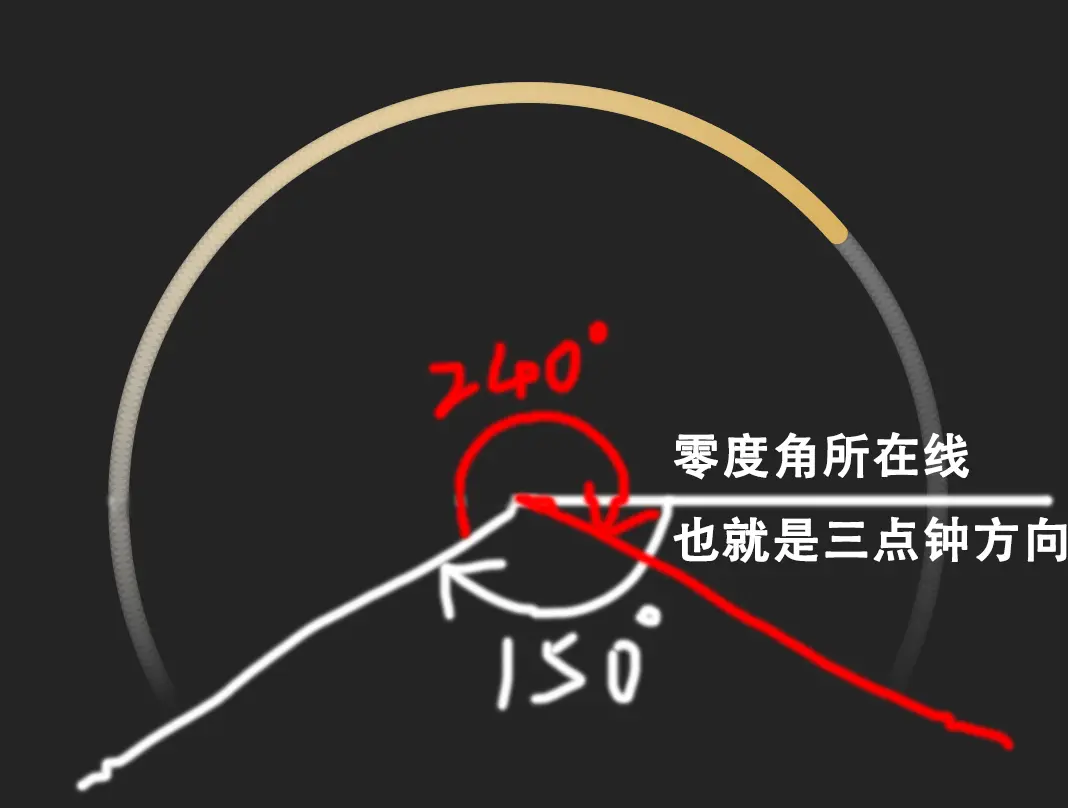 这里startAngle为何为150呢,也就是起始角度为150度,这150代表什么呢?因为我之后画圆环调用的是drawArc函数,我们跳转进去查看一下便可发现如下说明The arc is drawn clockwise. An angle of 0 degrees correspond to the geometric angle of 0 degrees (3 o'clock on a watch.),也就是说,零度角是在时钟三点钟方向,沿着顺时针方向角度依次增大,如果还不懂的话,那就看我下面这张图的分析。