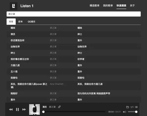 我想大部分人对听音乐是强需求吧?如果没有音乐,那么你的生活里将不在有色彩。有人喜欢用网易云音乐、有人喜欢用虾米、QQ 音乐等,但是想大家不可能同时装这么多客户端吧?因为版权的原因,每个在线音乐网站都没有做到完全的曲库,你又不可能把每个音乐网站都买上会员,所以有时候你需要去不同的网站搜索音乐,这个时候请使用 Listen 1,简直不要太良心。它长这样: